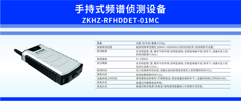 便携式频谱侦测设备ZKHZ-RFHDDET-01MC是一款针对无人机进行预警、识别和跟踪的手持式无线电侦测设备,其采用协议解析、无线电特征匹配的方式对无人机目标的位置进行获取,针对大疆系列o2、o3、o4数据协议的无人机和部分公有协议无人机可实现协议解析定位,针对FPV、WIFI、组装无人机可以通过无线电特征进行预警,多台设备组网后可以基于TDOA定位技术对无人机进行定位跟踪,该设备有效预警探测空域半径可达1km(无遮蔽、低电磁干扰环境)以上,可广泛应用于机场、警务、会议等重点场所的低空安全保障场景。